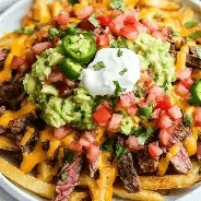 Queso fundido, steak, chipotle, guacamole, Cheddar, and tomatoes