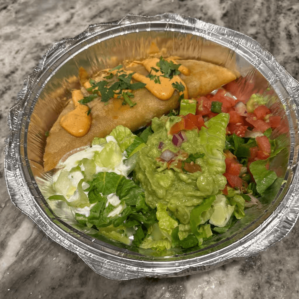 Fried burritos, rice, beans, queso sauce, lettuce, pico de gallo, guacamole, crema