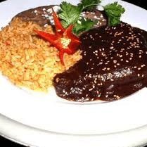 Chicken quarter, mole sauce, rice, beans, queso fresco and corn tortillas