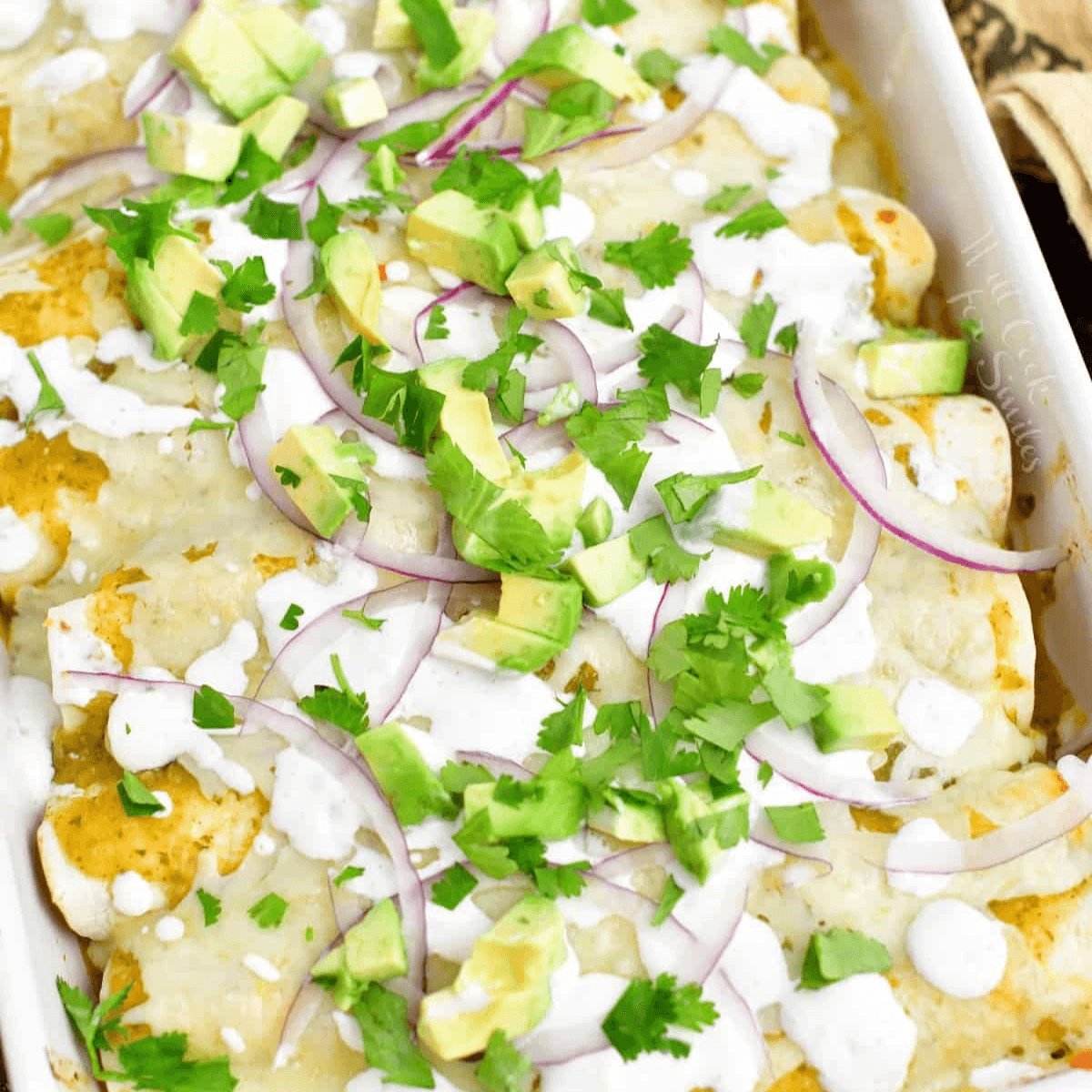 Three enchiladas stuffed with beef or chicken, rice, and beans with cream