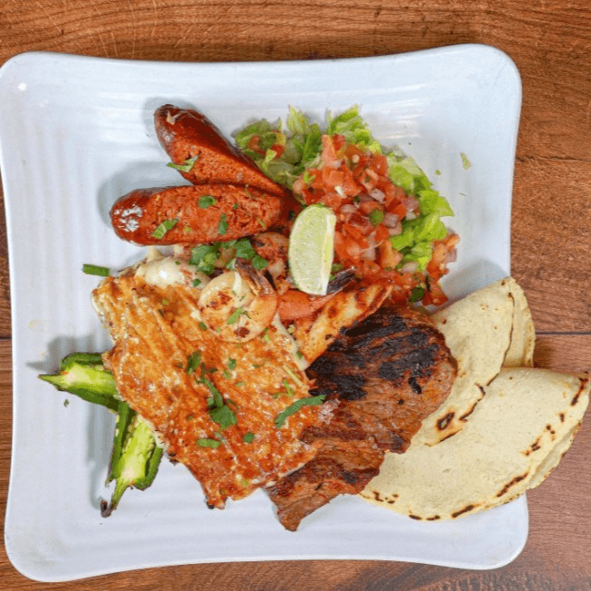 Grilled chicken, asada, chorizo, sauteed shrimp, rice, beans, corn tortillas
