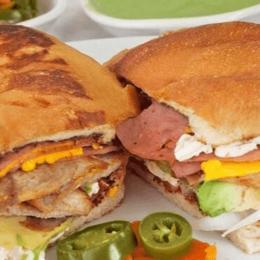 Fluffy bread, refried beans, lettuce, pickled jalapenos, queso Oaxaca, fries